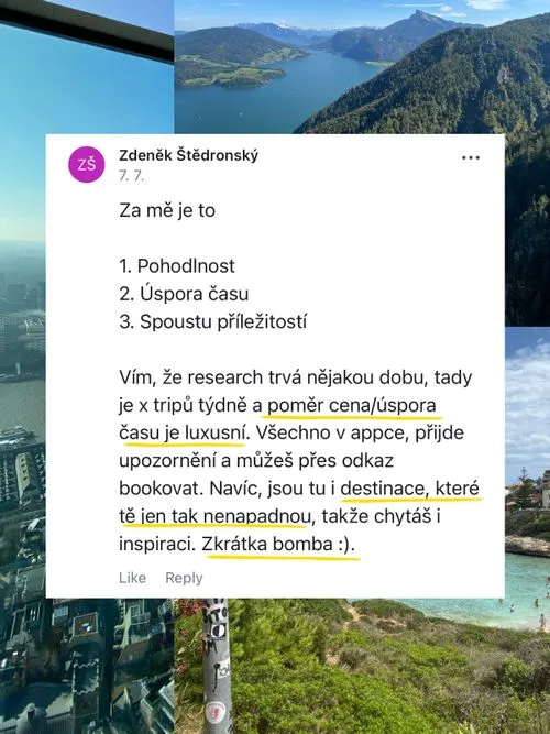 Jako první se dostaneš k těm nejvýhodnějším letenkám a ubytováním. Budu ti posílat přes 100 tipů každej měsíc, stačí kliknout na odkaz, koupit si letenku a cestuješ víc za míň.